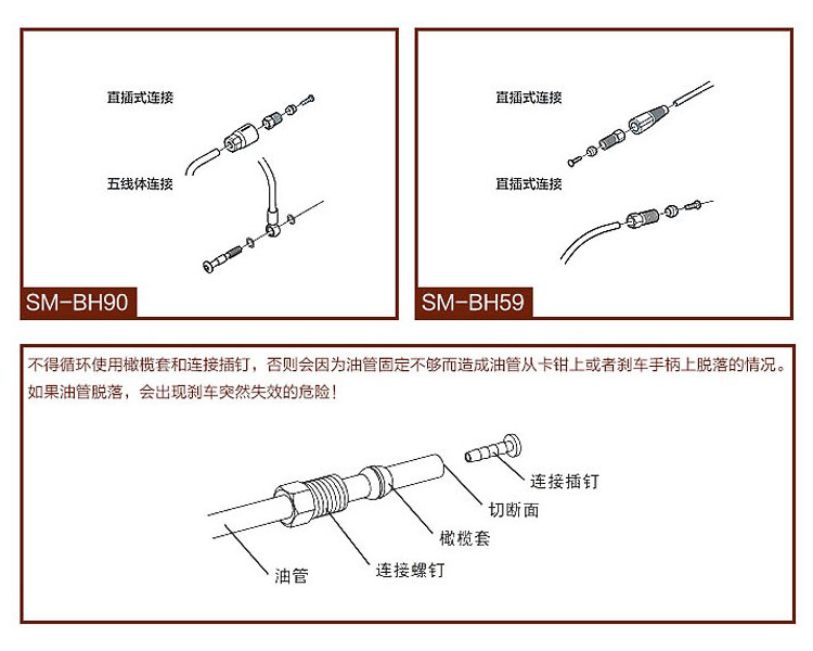 說明:欖頭是靠變形包在油管上起到固定與密封作用的,使用后的橄欖頭會(huì)變形且不可拆卸,所以鎖橄欖頭是一次性的。shimano剎車油管分為BH90/BH59,不同油管需要使用對(duì)應(yīng)橄欖頭跟油針。