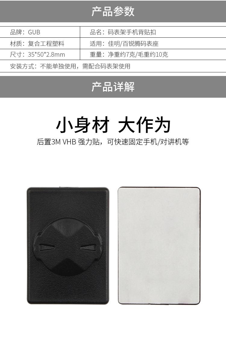 名稱:GUB 碼表座背貼扣 適用:手機、對講機等 材質(zhì):復合工程材料 規(guī)格:佳明/百銳騰 重量:約7克(凈重)/約10克(毛重) 統(tǒng)一零售價:12元