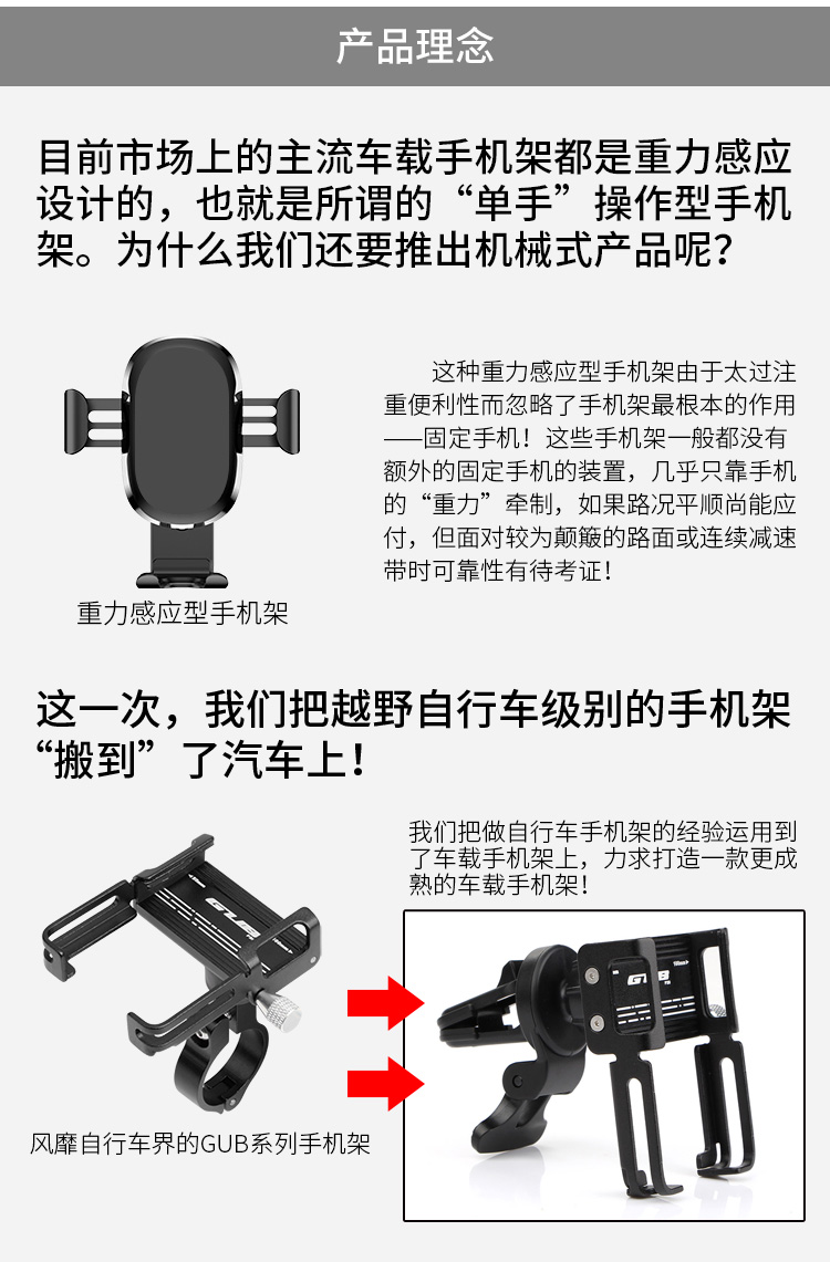 特點(diǎn):鋁合金架體+PC固定組件,55-100mm寬度的手機(jī)均可使用,萬向球+可旋轉(zhuǎn)夾口讓使用更加隨心所欲!
