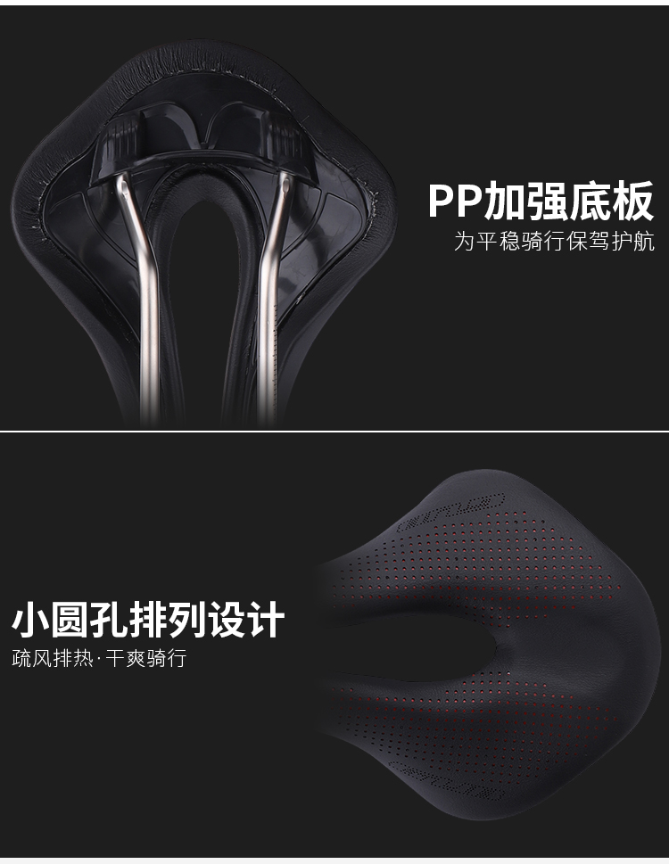 特色:超纖皮表面耐磨有質感,鉻鉬鋼中空軌道強度高,小圓點排列設計,疏風排熱,加強PP底板,平穩(wěn)輸出,安心騎行!