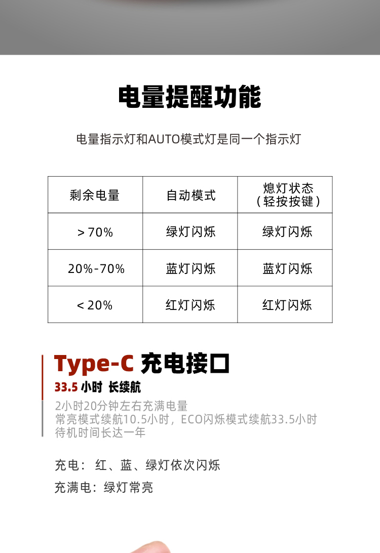 燈光模式:常亮/呼吸閃/慢閃/快閃/節(jié)奏閃/ECO快閃