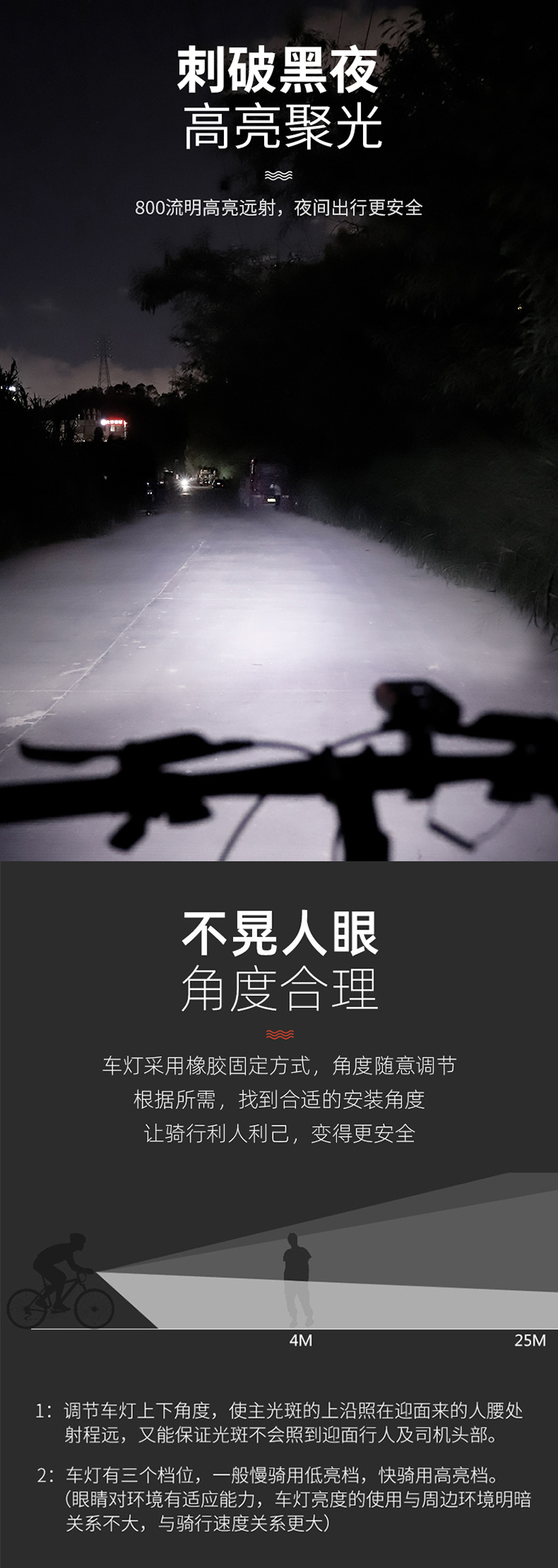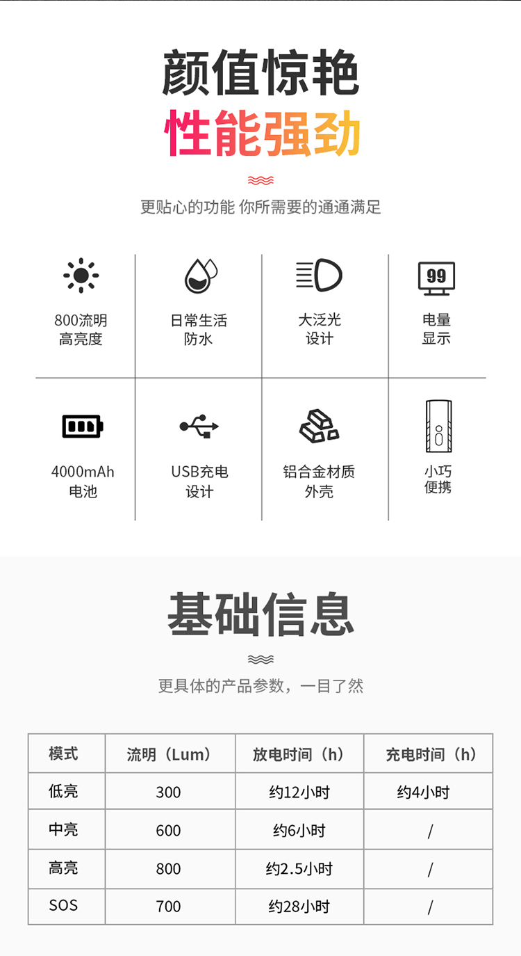 燈光模式:低亮/中亮/高亮/SOS