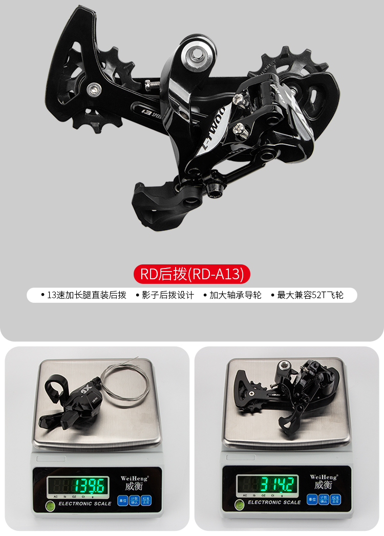 后撥:13速加長腿直裝后撥,影子后撥設(shè)計,加大軸承導(dǎo)輪,最大兼容52T飛輪