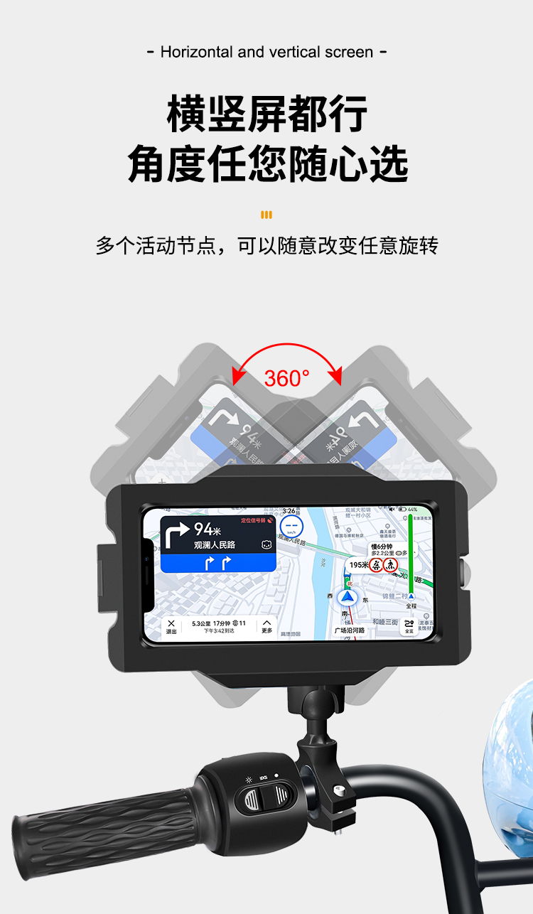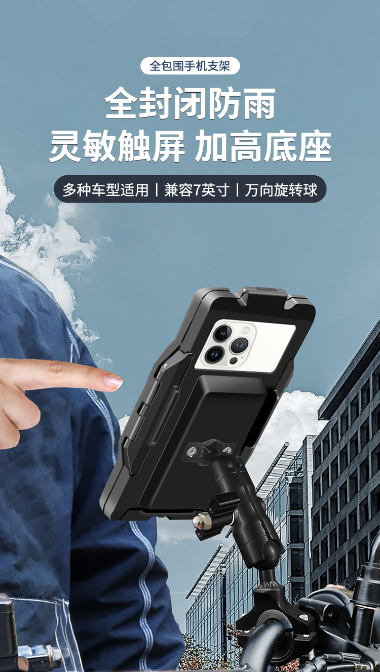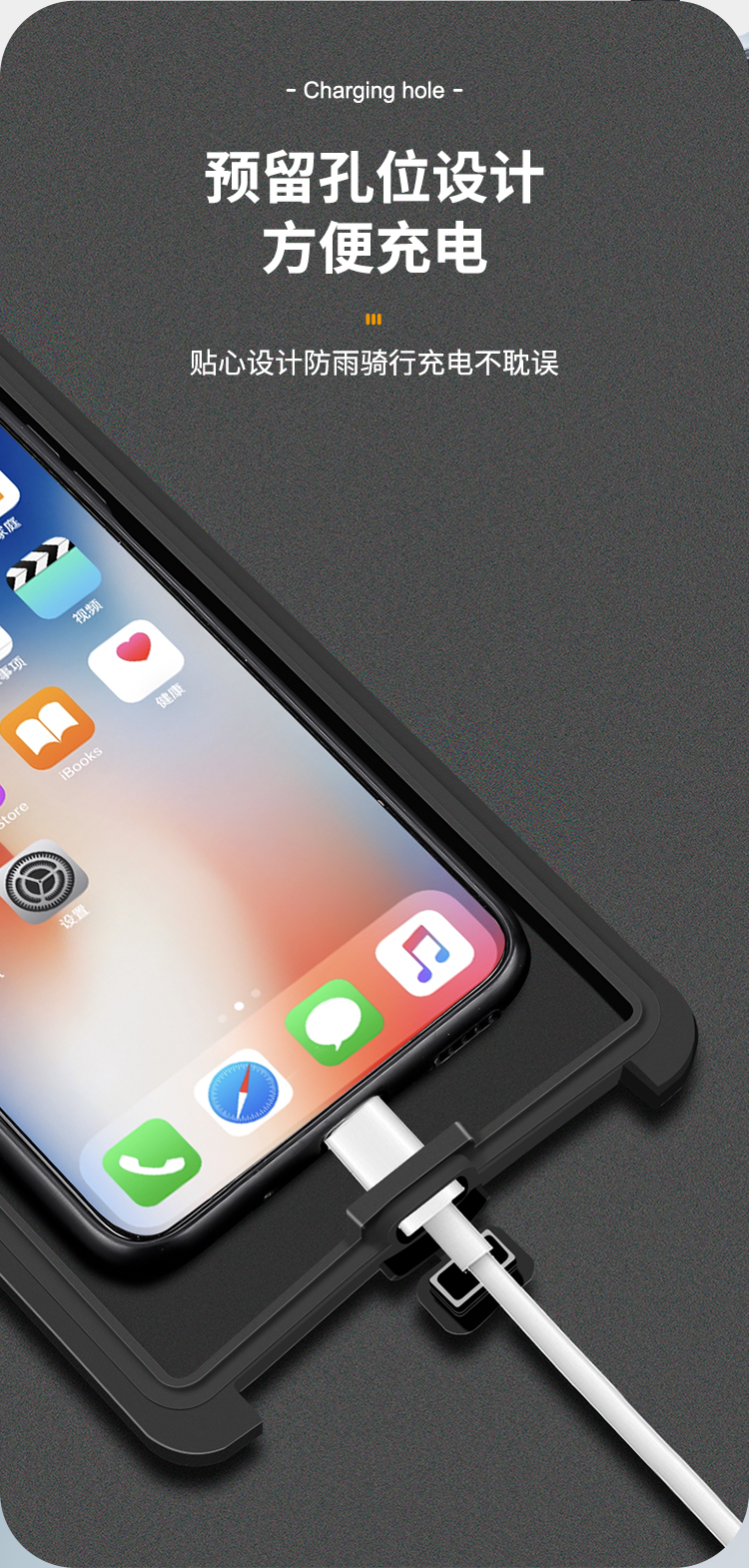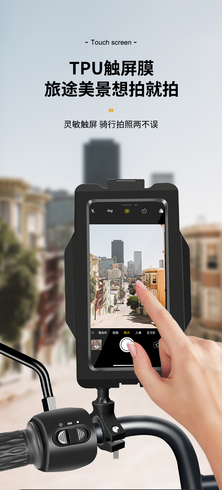 特點:鋁合金支撐架,全封閉手機(jī)盒,防雨無憂,高兼容性不挑手機(jī)型號,摩托車、電動車等都可使用,滿足多場景使用需求。