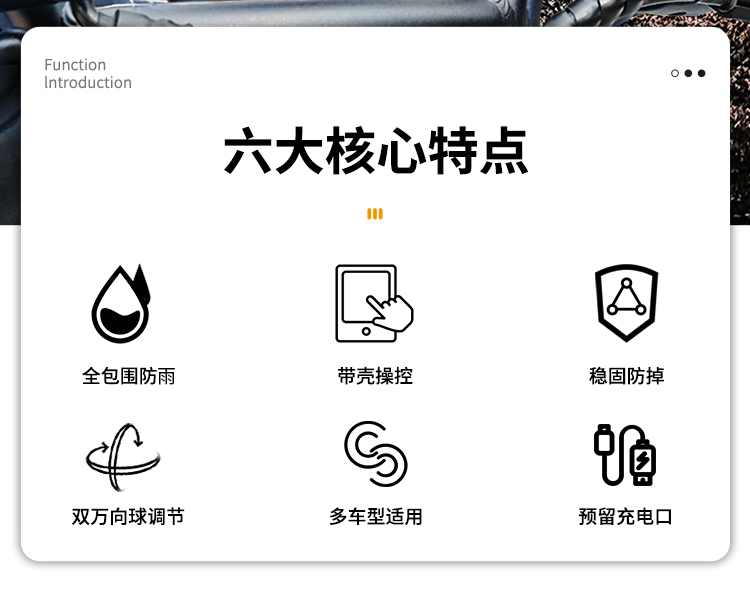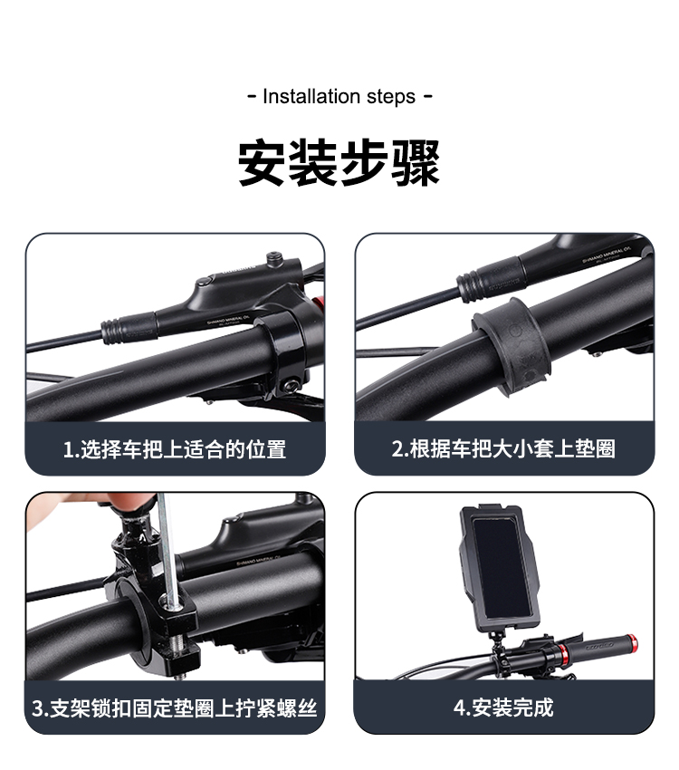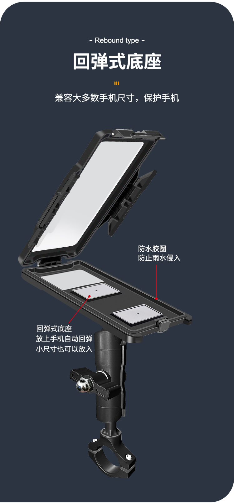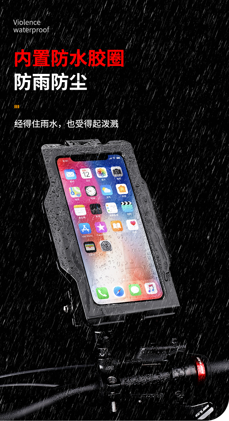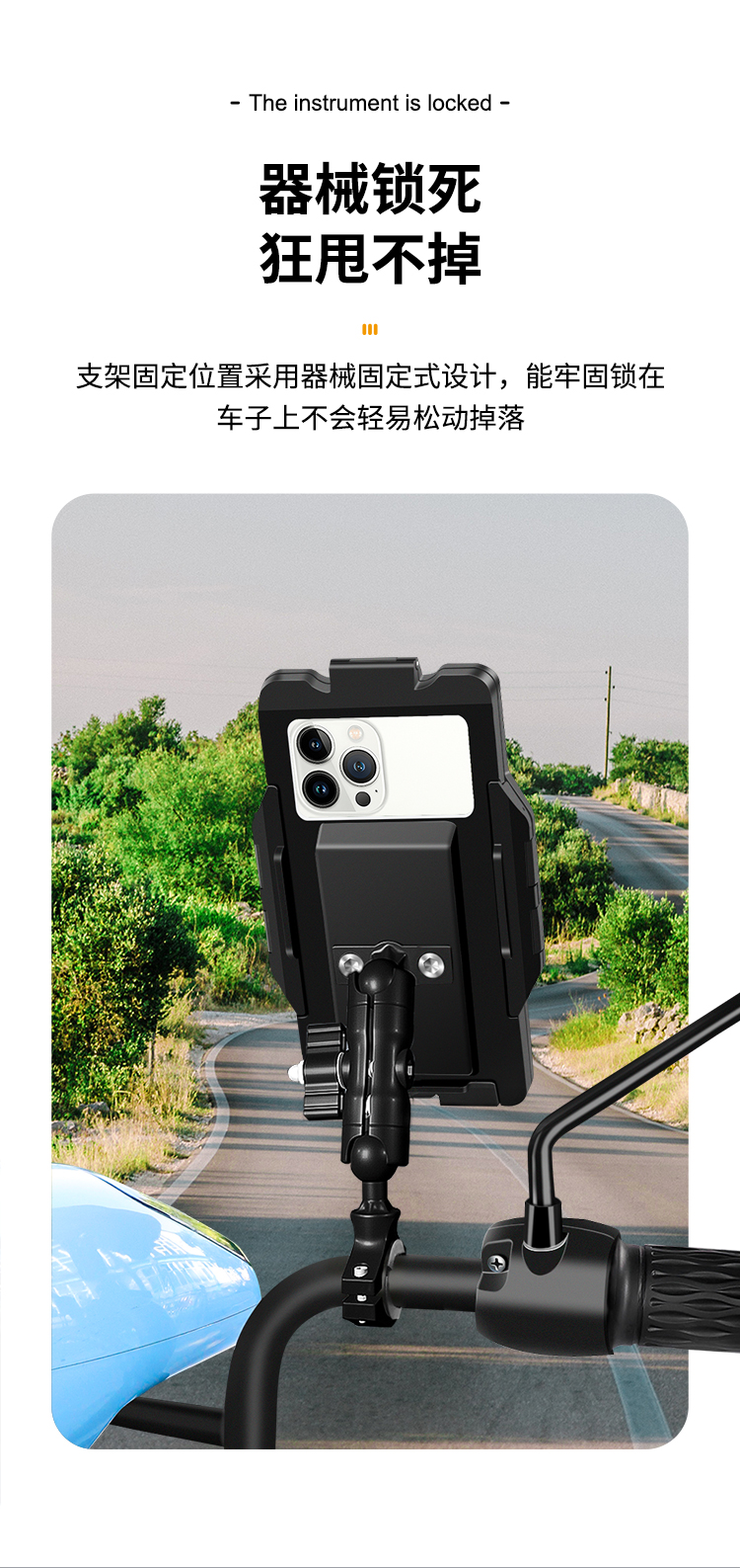 特點:鋁合金支撐架,全封閉手機(jī)盒,防雨無憂,高兼容性不挑手機(jī)型號,摩托車、電動車等都可使用,滿足多場景使用需求。