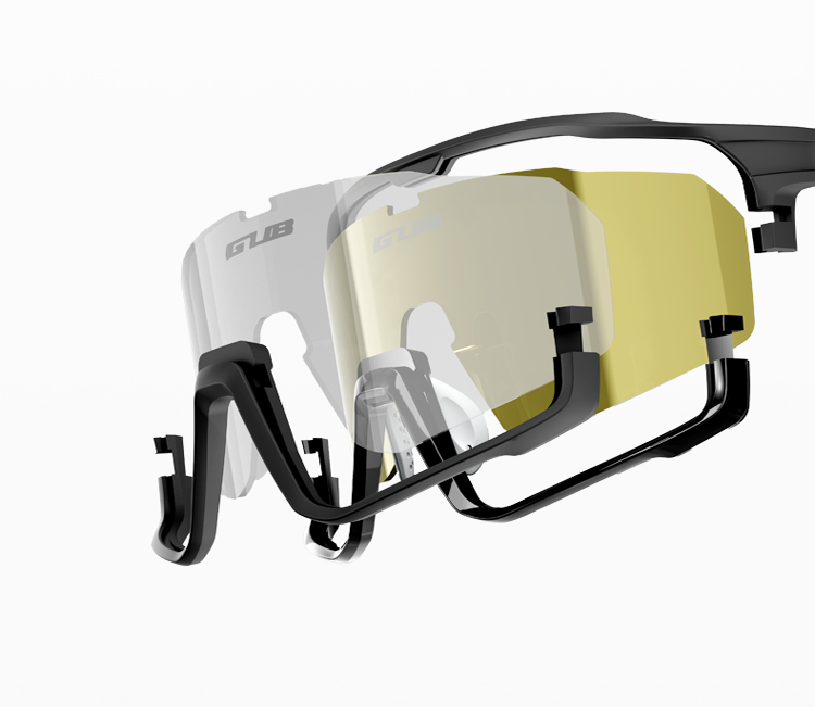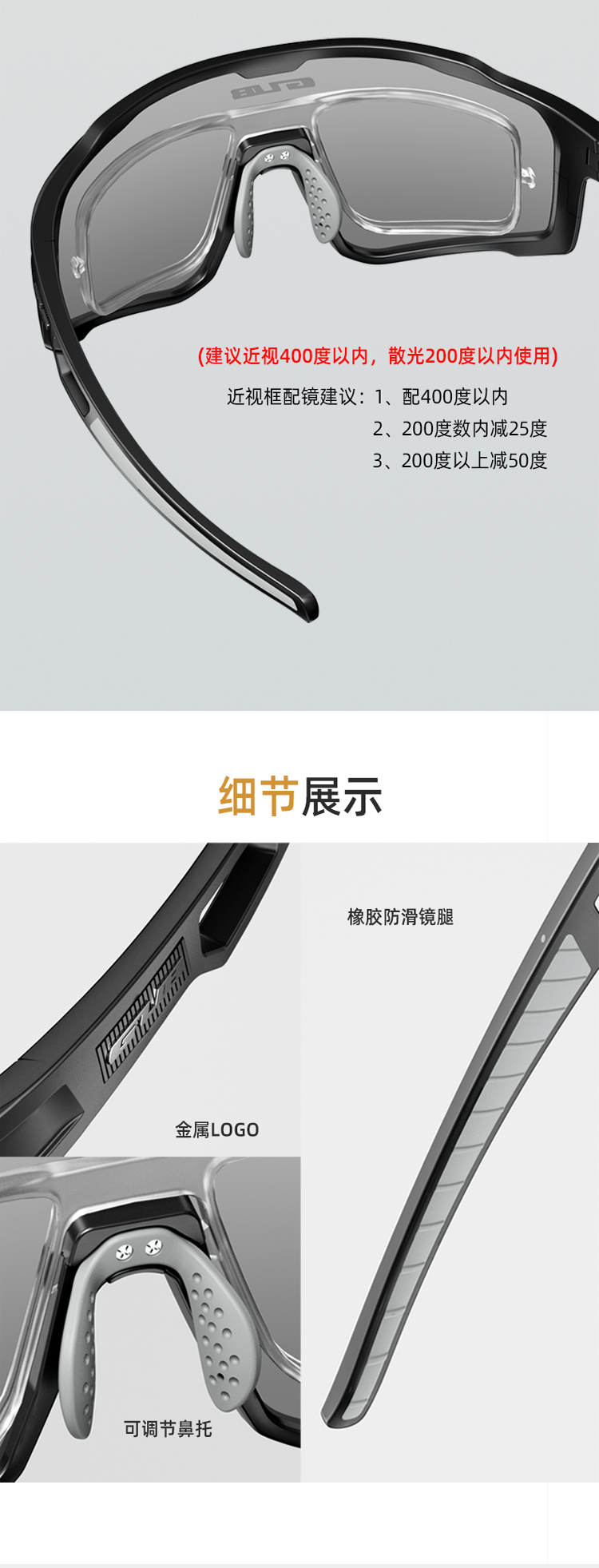 特點:標配透明變色片,另贈送一副偏光鏡片和下框,一副眼鏡,四種顏色搭配,滿足個性需求。專利設計上下可拆卸框,快速更換鏡片。