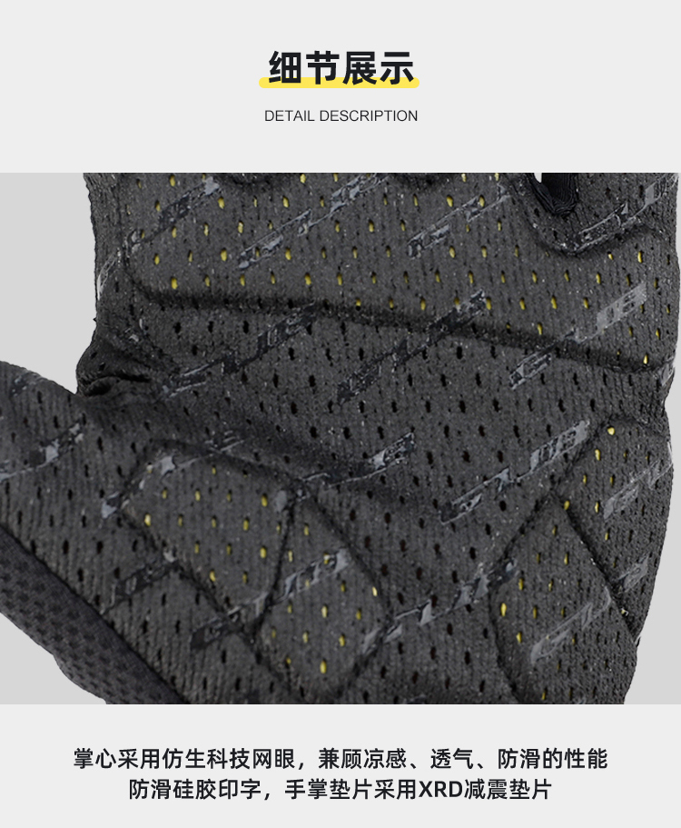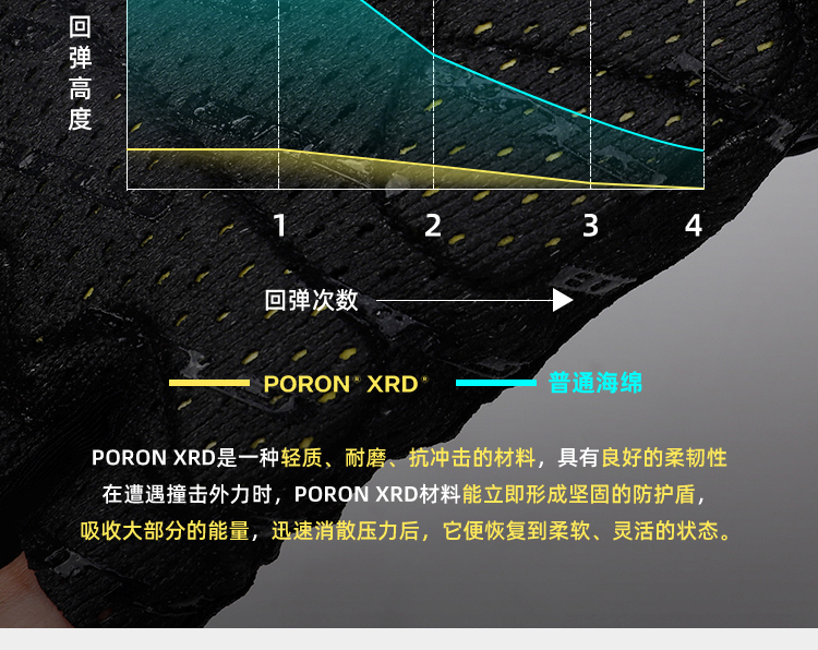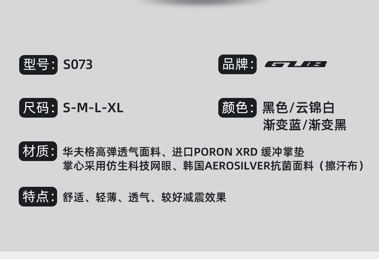 材質(zhì):華夫格高彈透氣面料、進(jìn)口PORON XRD 緩沖掌墊、掌心采用仿生科技網(wǎng)眼、韓國Aerosilver抗菌面料(擦汗布)