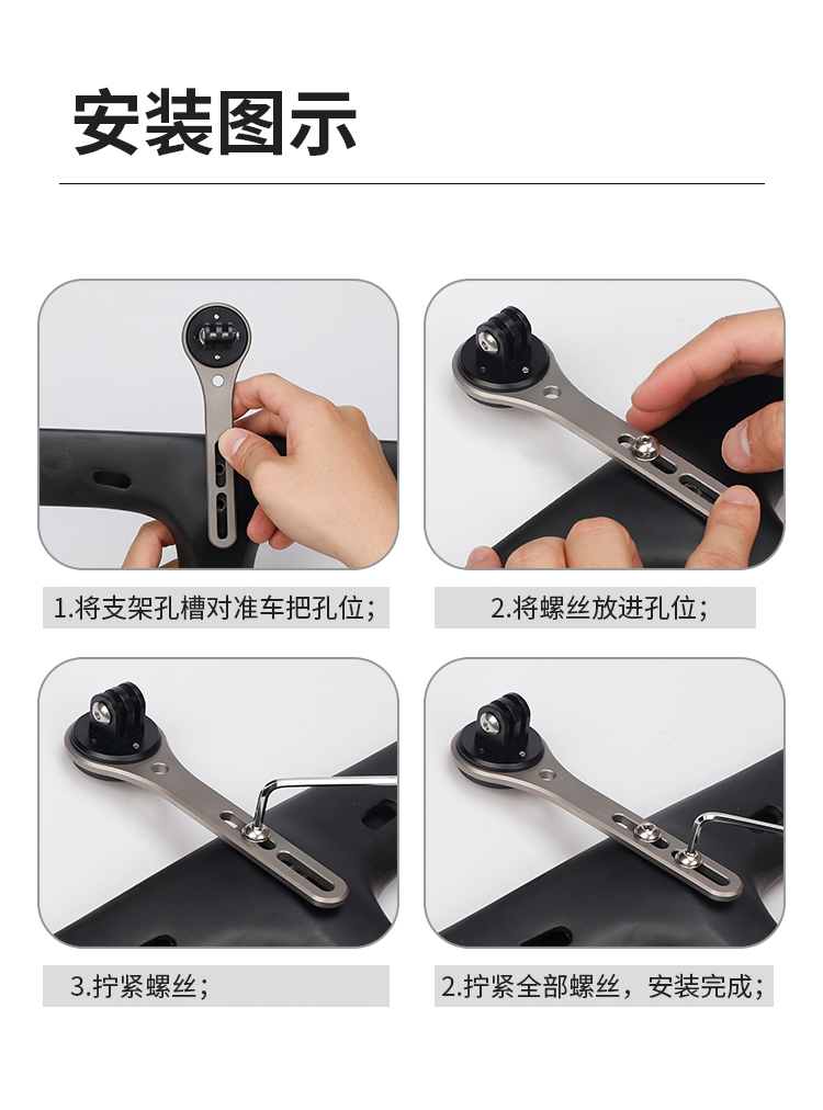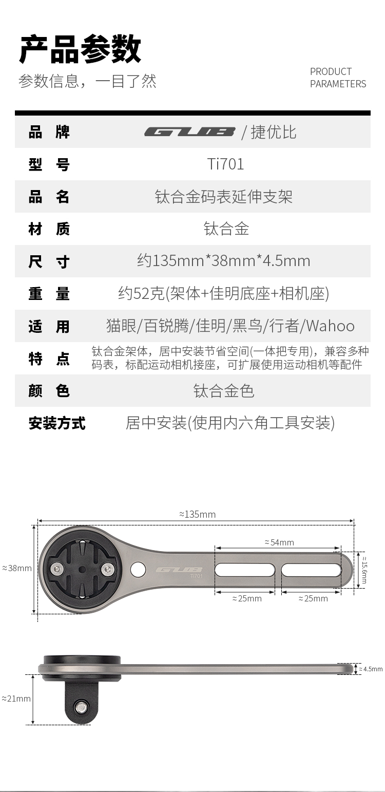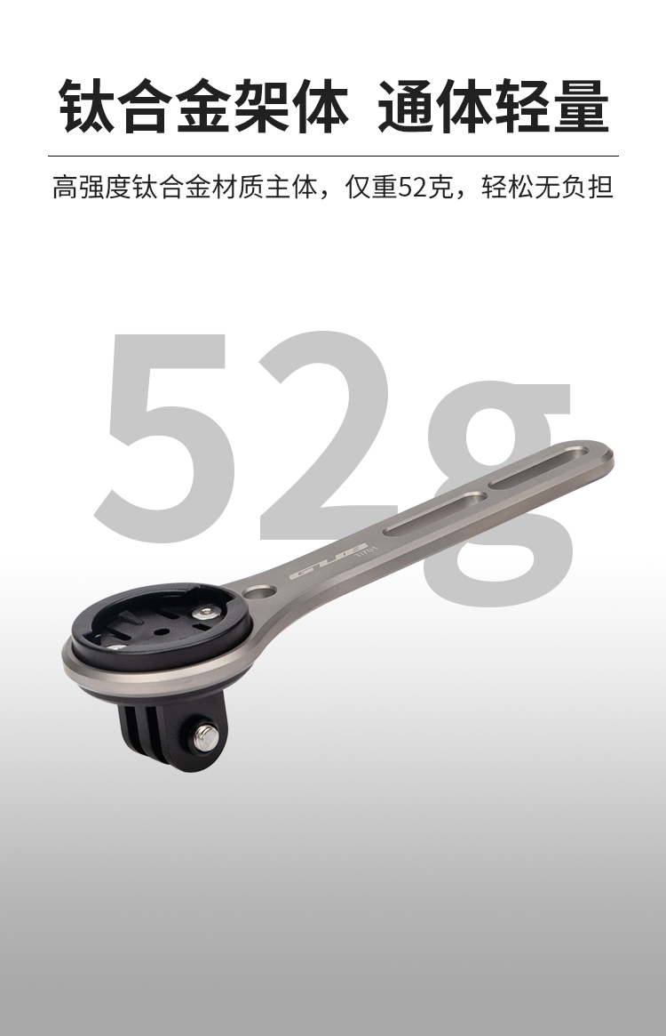 特點:鈦合金架體,居中安裝節(jié)省空間(一體把專用),兼容多種碼表,標(biāo)配運動相機接座,可擴展使用運動相機等配件