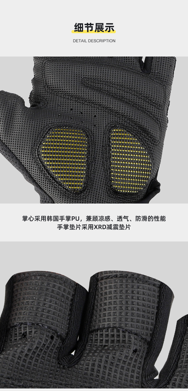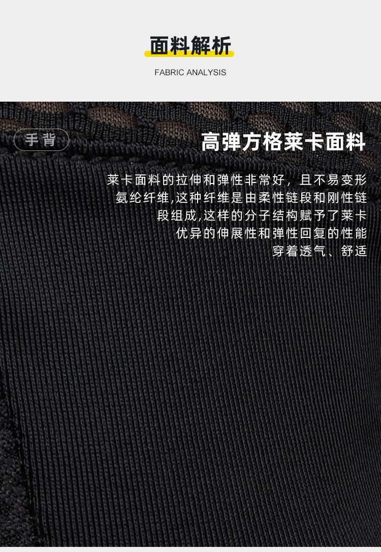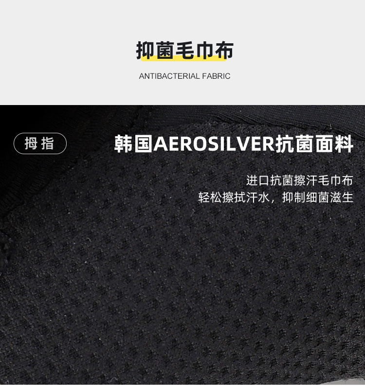 材質:高彈萊卡方格面料、進口PORON XRD 緩沖掌墊、掌心采用韓國進口PU、韓國Aerosilver抗菌面料(擦汗布)