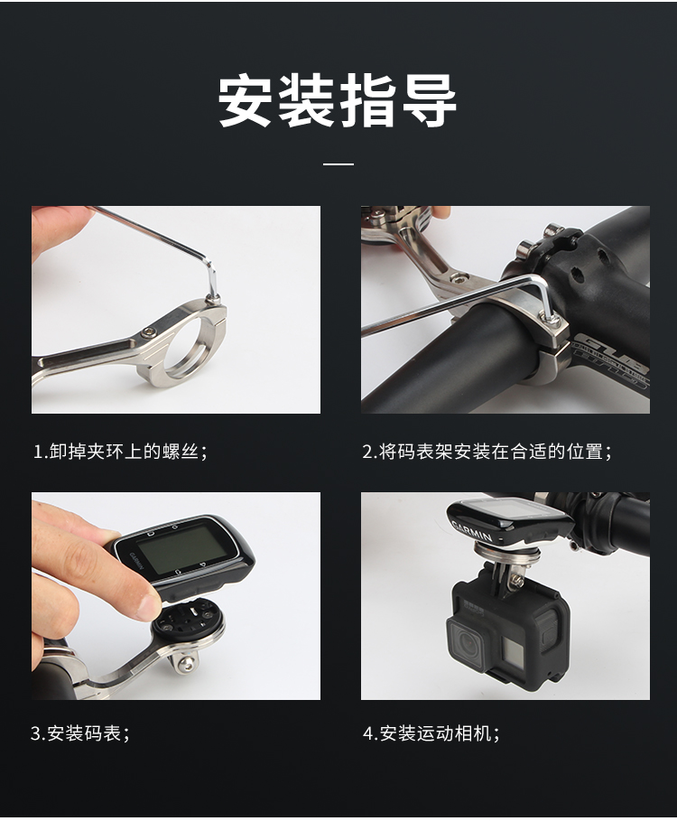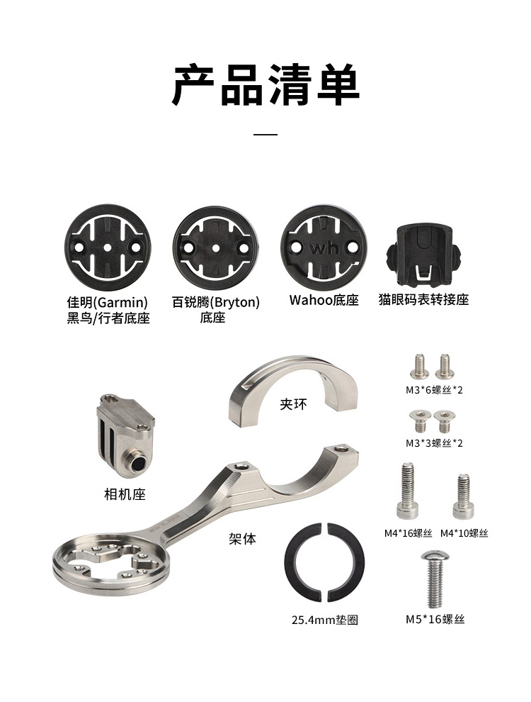 配置:配運(yùn)動(dòng)相機(jī)轉(zhuǎn)接座,wahoo、佳明、百銳騰和貓眼碼表接座、25.4mm墊圈一對