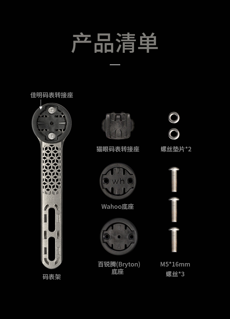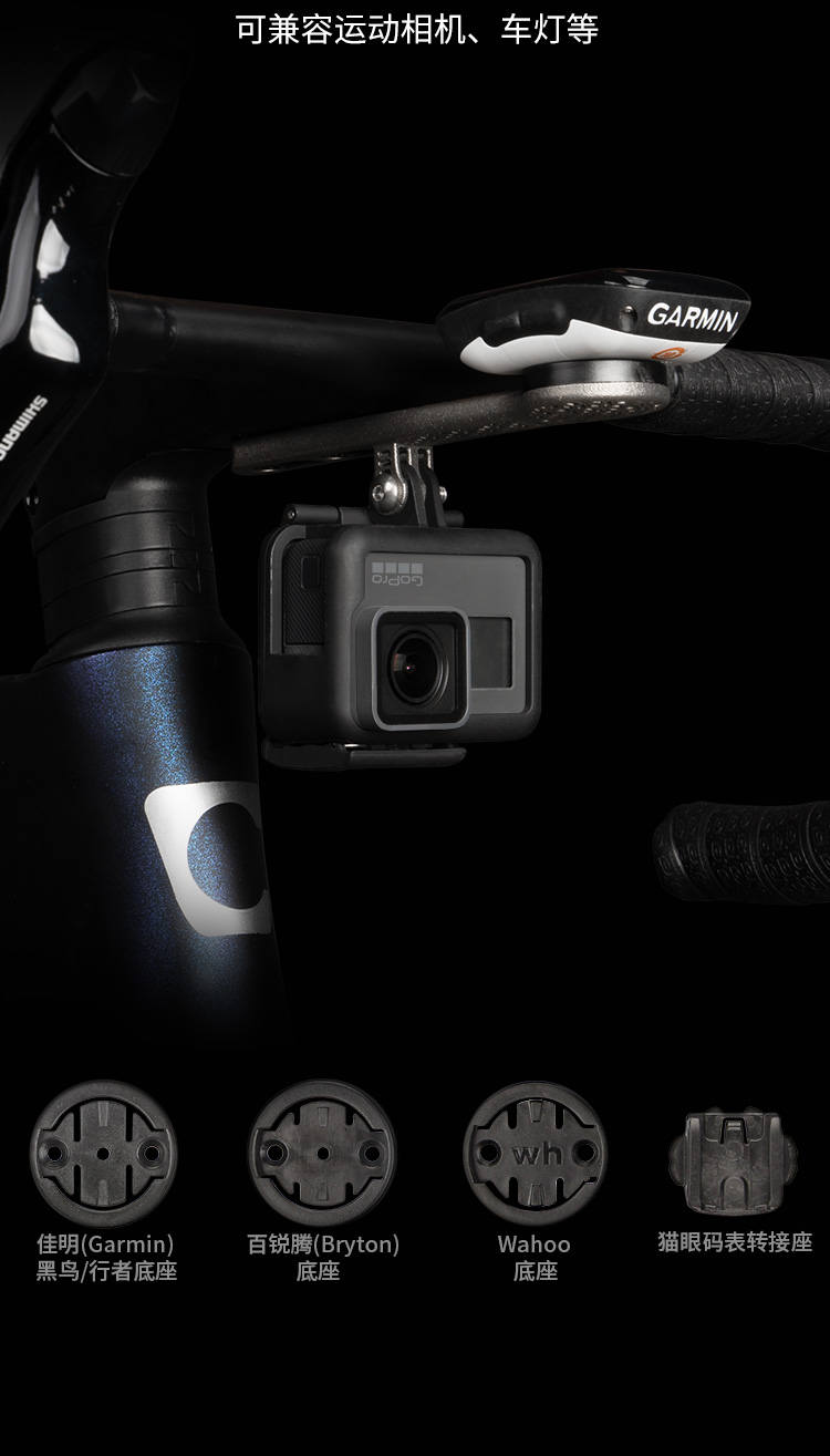 特點:鈦合金架體,3D打印工藝,居中安裝節(jié)省空間(一體把專用),兼容多種碼表,標(biāo)配運動相機接座,可擴(kuò)展使用運動相機等配件