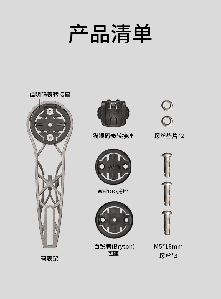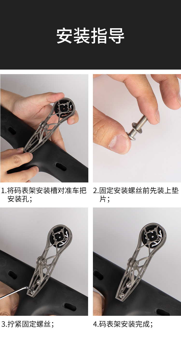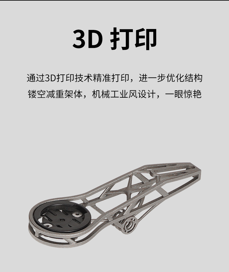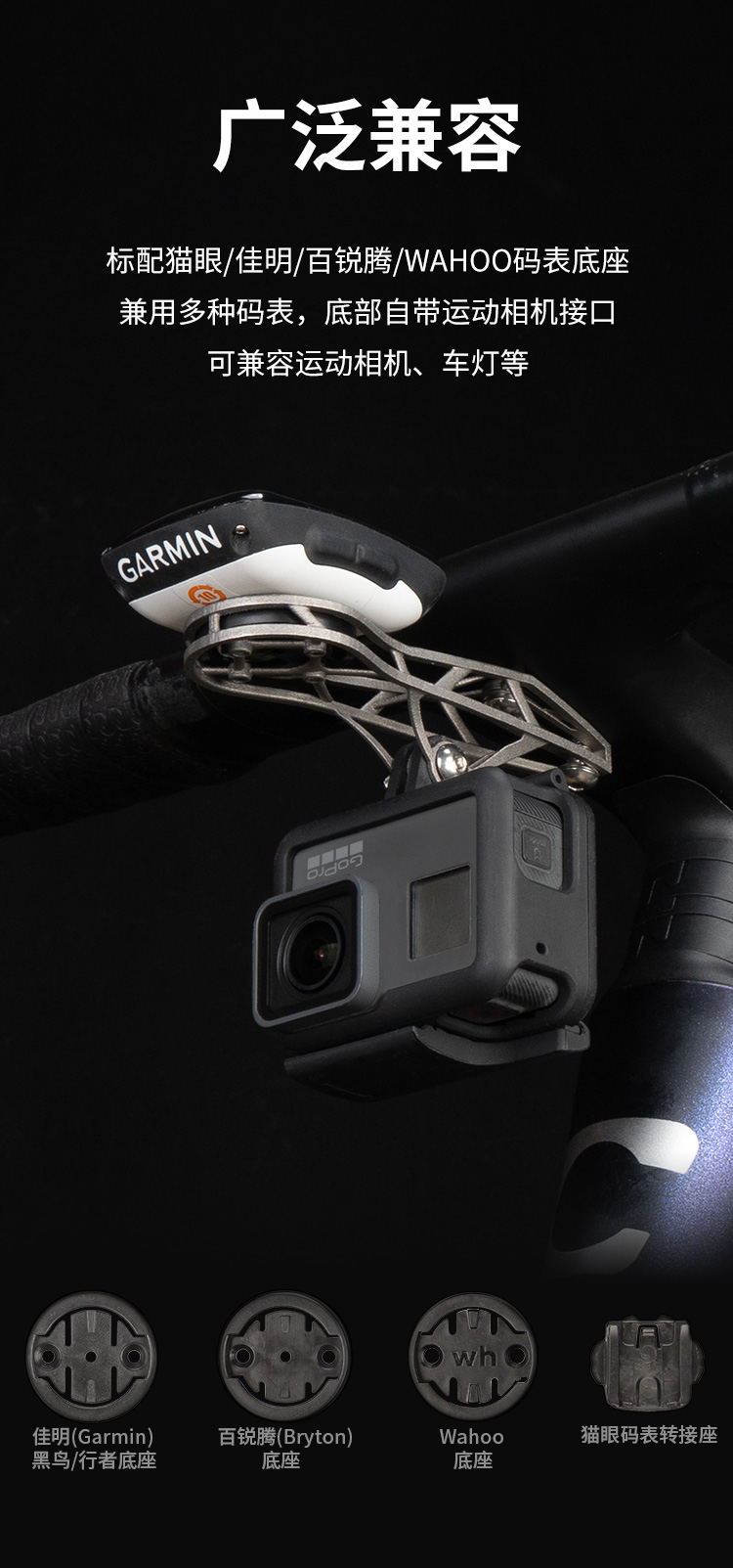 特點(diǎn):鈦合金超輕架體,3D打印工藝,居中安裝節(jié)省空間(一體把專用),兼容多種碼表,標(biāo)配運(yùn)動(dòng)相機(jī)轉(zhuǎn)接座,可擴(kuò)展使用運(yùn)動(dòng)相機(jī)等配件