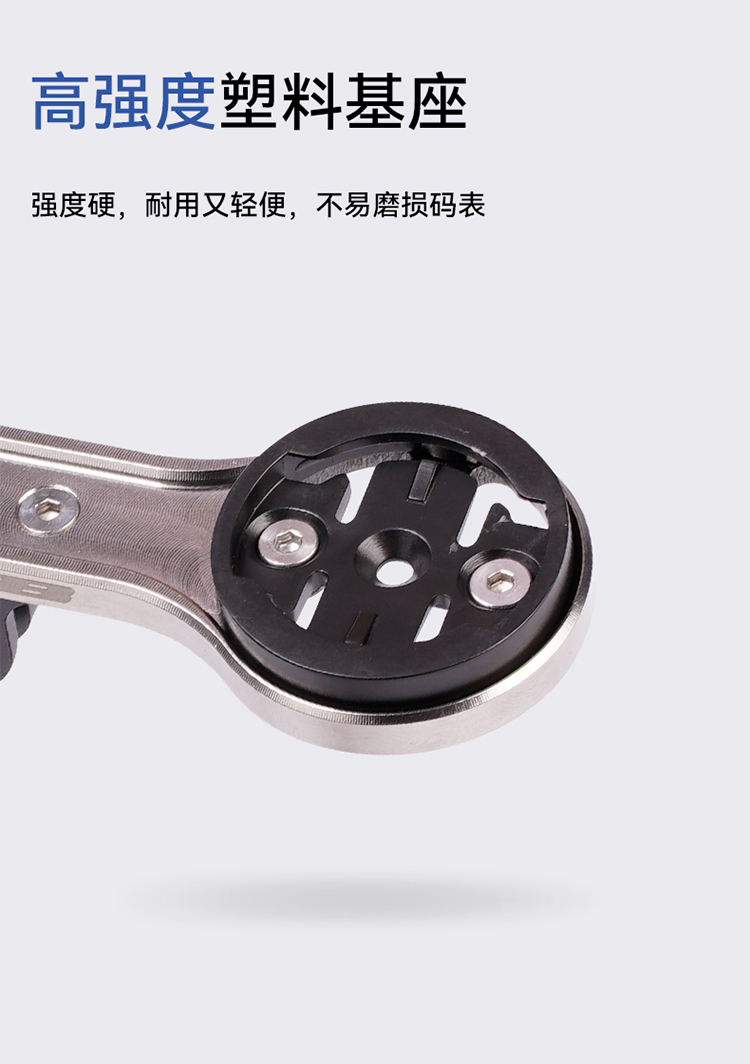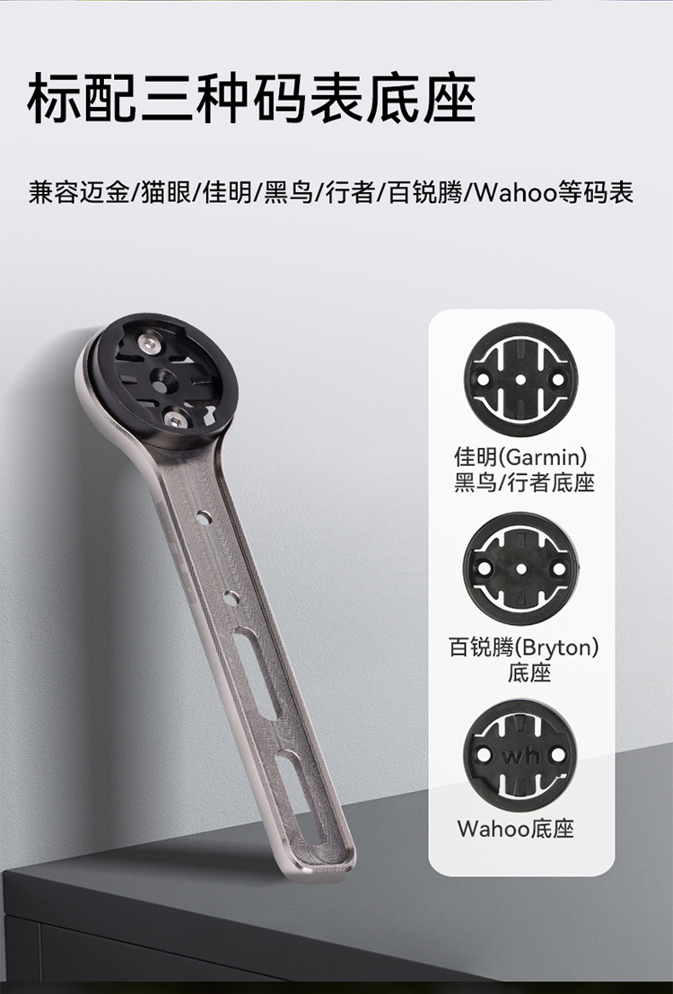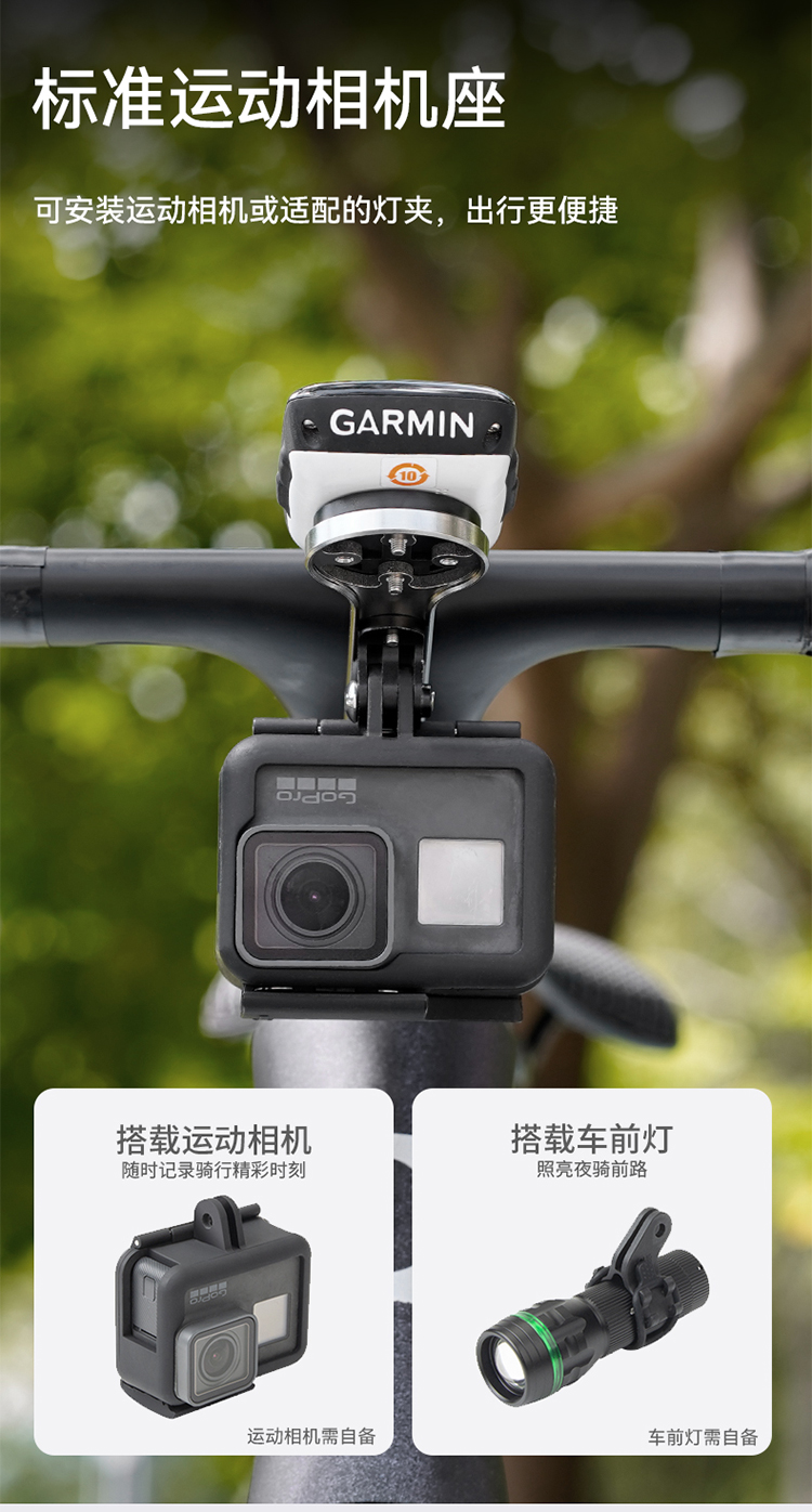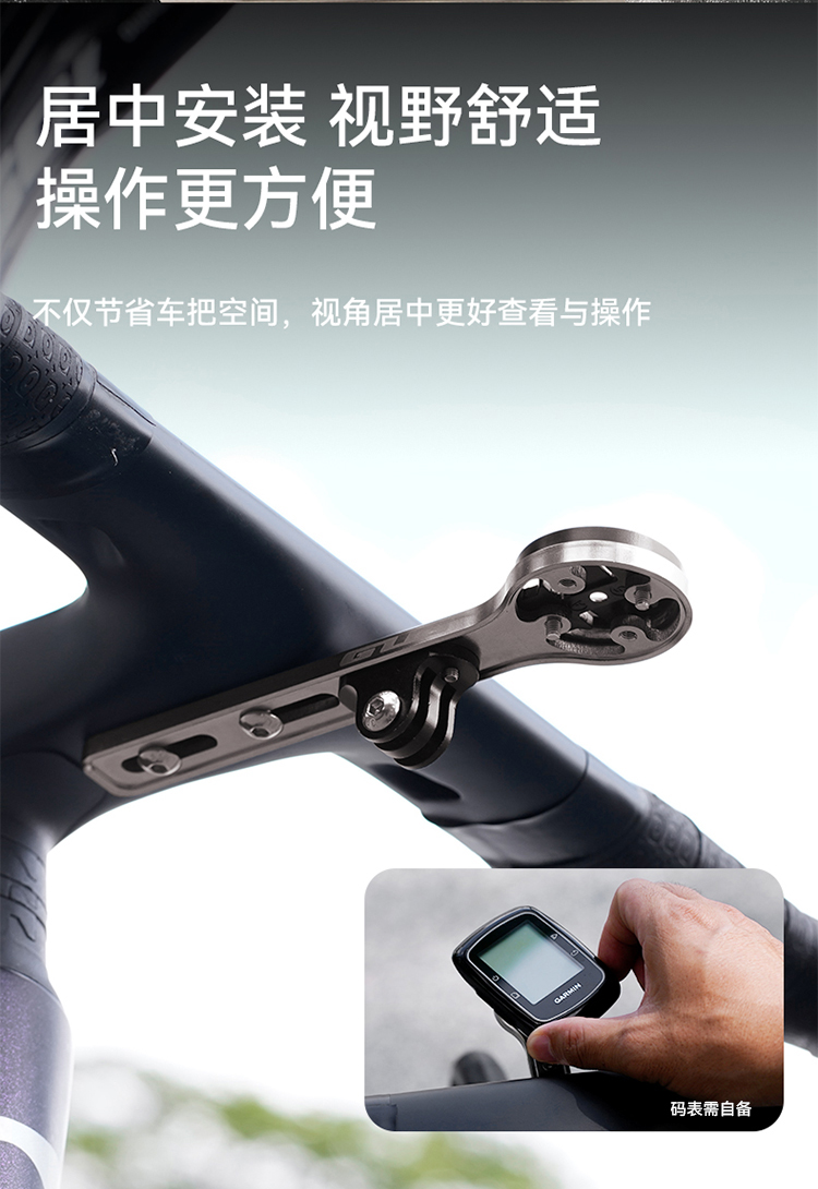 特點:鈦合金超輕架體,居中安裝節(jié)省空間(一體把專用),兼容多種碼表,標(biāo)配運動相機轉(zhuǎn)接座,可擴展使用運動相機等配件