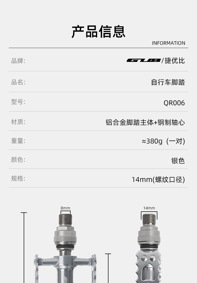重量:雙快拆凈重約380克/對,毛重約456克 ;左快拆右螺紋腳踏凈重約340克/對,毛重約438克