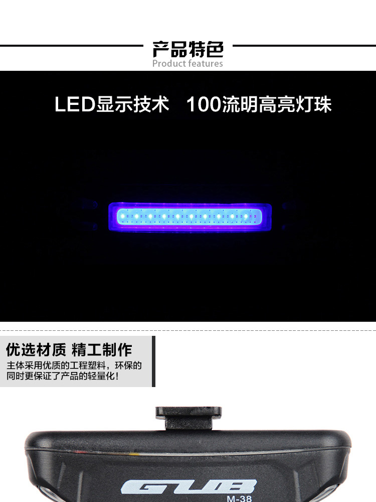 特性:LED技術(shù),COB整面發(fā)光,高亮100流明設(shè)計,實現(xiàn)整體流暢設(shè)計;配備USB接口,可循環(huán)充電;2種模式7種效果可循環(huán)切換;電池自動保護功能,電壓低于2.8V不工作;硅膠捆扎固定方式,120度方位調(diào)整,方便拆卸安裝;方型背扣設(shè)計,可橫向和縱向不同角度安裝;可安裝在坐管,下叉,車把手,前叉等。