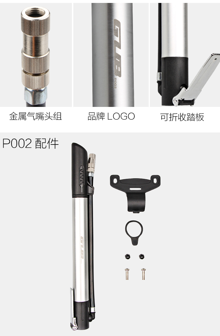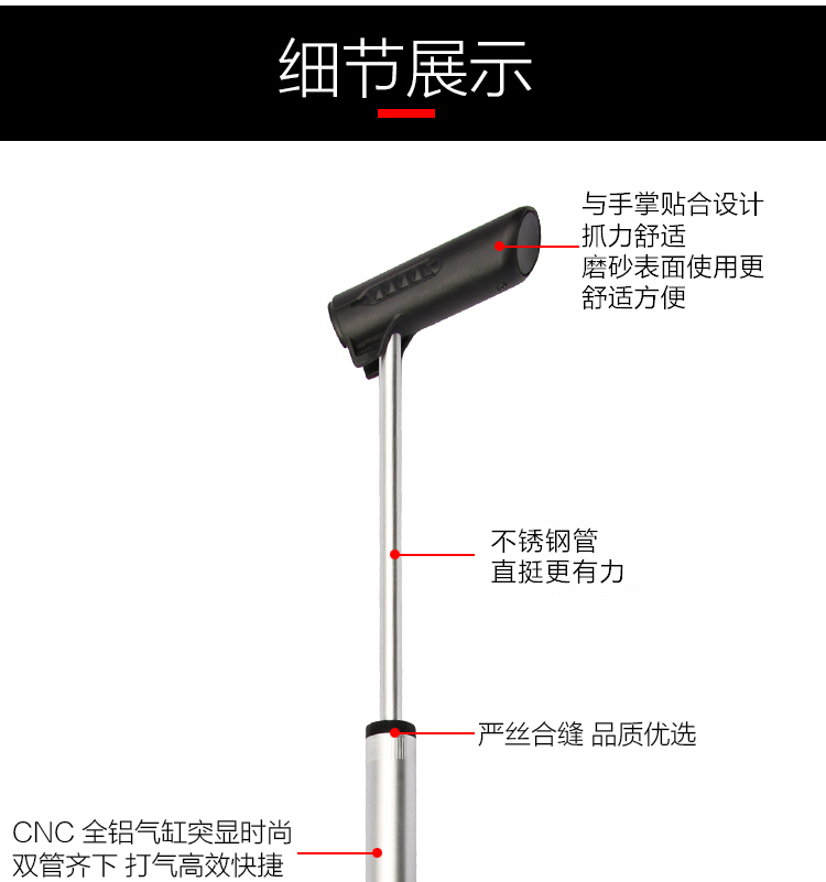 特點:鋁合金氣缸,體積小不占地方,美嘴法嘴兼用,帶固定支架可安裝在車架上
