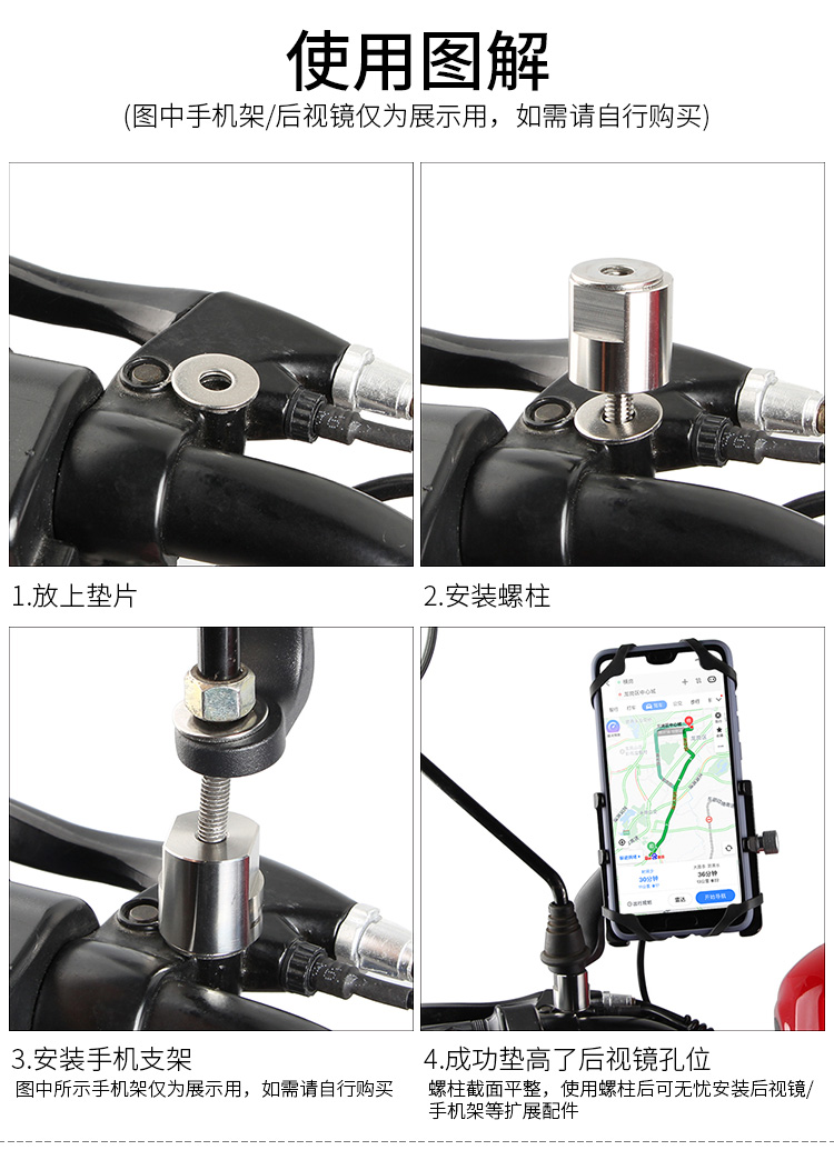 簡介:此配件為后視鏡輔助配件,采用不銹鋼材質(zhì),耐用不生銹,用于摩托車/電動車后視鏡孔位的擴展,起到墊高或更好適配的作用。