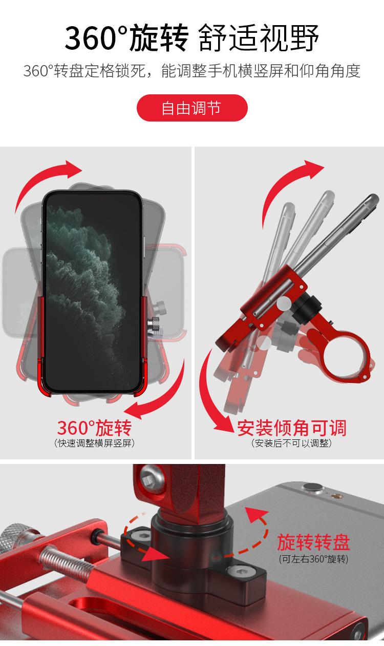 特點(diǎn):鋁合金架體,高兼容性不挑手機(jī)型號,自行車、電動車等都可使用!