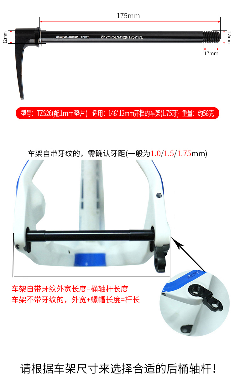 說(shuō)明:請(qǐng)根據(jù)車(chē)架尺寸選擇合適的桶軸桿!