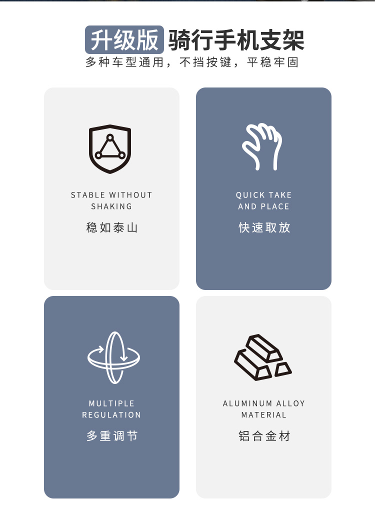 特點(diǎn):鋁合金架體,高兼容性不挑手機(jī)型號,摩托車、電動車等都可使用,四面環(huán)繞固定,夾手機(jī)更牢固,快速取放省時省力,雙萬向球旋轉(zhuǎn)系統(tǒng),滿足多場景使用需求。